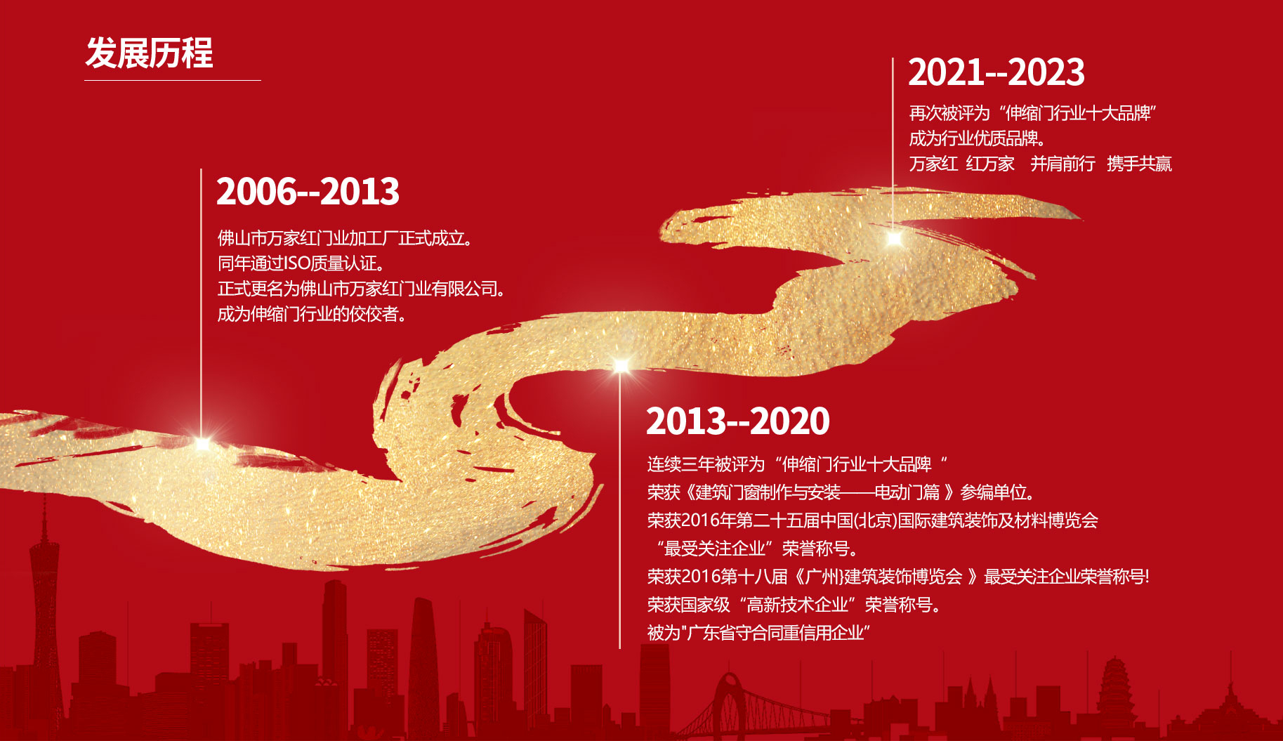 佛山市萬(wàn)家紅門(mén)業(yè)有限公司是一家集研發(fā)、生產(chǎn)、銷(xiāo)售、服務(wù)于一體的國(guó)際化智能門(mén)業(yè)企業(yè),以“創(chuàng)新、敬業(yè)、誠(chéng)信、卓越”為經(jīng)營(yíng)理念,以“打造百年企業(yè)”為發(fā)展目標(biāo)。憑借卓越的產(chǎn)品品質(zhì)、精湛的研發(fā)技術(shù)、獨(dú)特的營(yíng)銷(xiāo)模式引領(lǐng)中國(guó)制造,產(chǎn)品涵蓋智能段滑門(mén)、分段平開(kāi)門(mén)、智能懸臂門(mén)、直線(xiàn)平移門(mén)、懸浮折疊門(mén)、電動(dòng)伸縮門(mén)、智能小門(mén)、車(chē)牌識(shí)別、道閘、升降柱等智能出入口設(shè)備。作為一家專(zhuān)注于智能電動(dòng)門(mén)的制造商,萬(wàn)家紅致力于為全球消費(fèi)者提供技術(shù)精湛、品質(zhì)卓越的電動(dòng)門(mén)產(chǎn)品、旗下諸多精品:"龍騰盛世”、"盛世至尊”、“招財(cái)進(jìn)寶”、“大唐盛世”、"衛(wèi)士"、"慶豐"、”盛世中華”等精英產(chǎn)品系列,將萬(wàn)家紅企業(yè)發(fā)展推向了一個(gè)新的舞臺(tái)。實(shí)力贏(yíng)取未來(lái),創(chuàng)新成就夢(mèng)想一展望未來(lái),萬(wàn)家紅門(mén)業(yè)將堅(jiān)持專(zhuān)業(yè)化的發(fā)展戰(zhàn)略,求真務(wù)實(shí),開(kāi)拓創(chuàng)新,以“締造全球優(yōu)質(zhì)的門(mén)業(yè)品牌企業(yè),成就萬(wàn)家紅百年好品牌”為目標(biāo),為“中國(guó)夢(mèng)"的實(shí)現(xiàn)貢獻(xiàn)更多的力量。